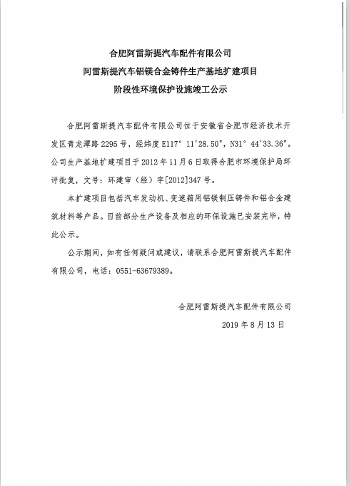 合肥阿雷斯提汽車配件有限公司阿雷斯提汽車鋁鎂合金鑄件生產(chǎn)基地?cái)U(kuò)建項(xiàng)目階段性環(huán)境保護(hù)設(shè)施竣工公示