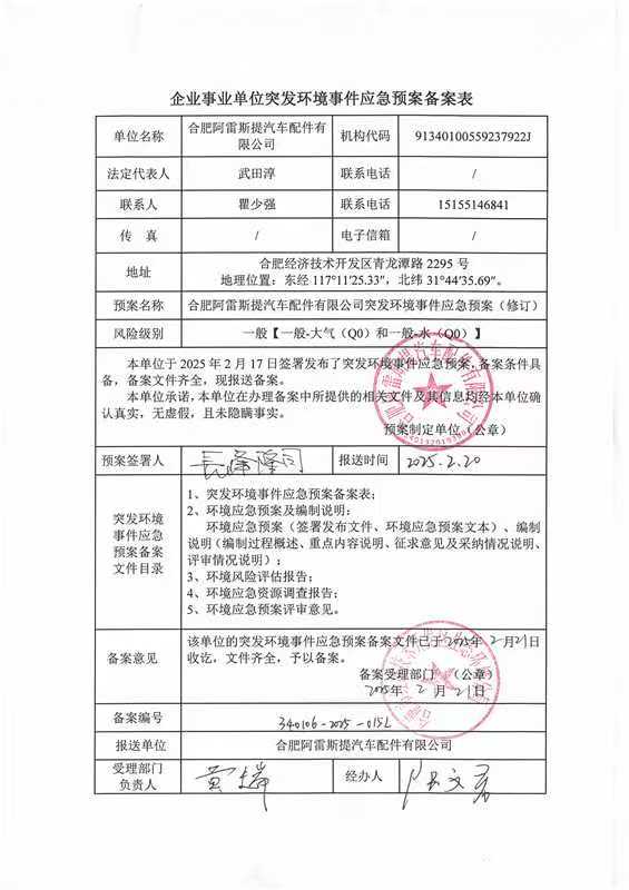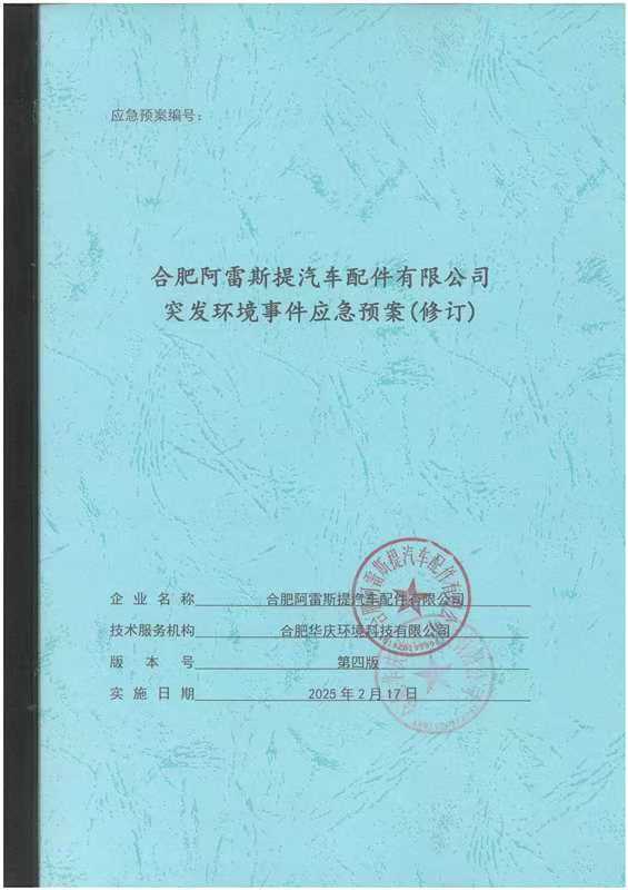 合肥阿雷斯提汽車(chē)配件有限公司突發(fā)環(huán)境事件應(yīng)急預(yù)案(終稿)